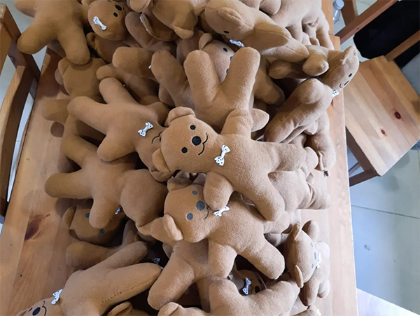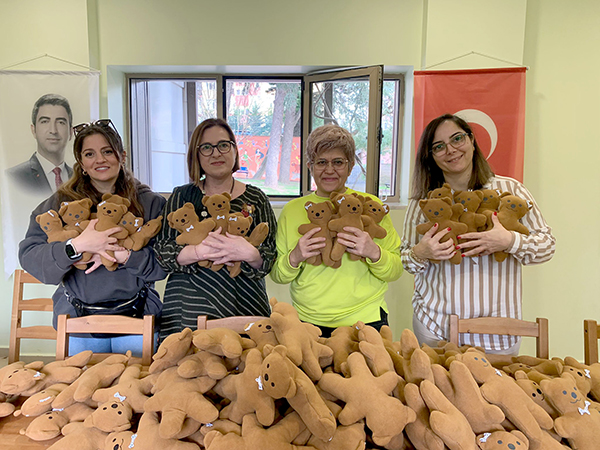 Kalıplar çizildi, kumaşlar kesildi ve polar kumaştan kesimi yapılan oyuncak ayıcıkların, içleri tek tek dolduruldu ve depremzede çocuklarla hediye edilmek üzere Hatay’a doğru yola çıktı.