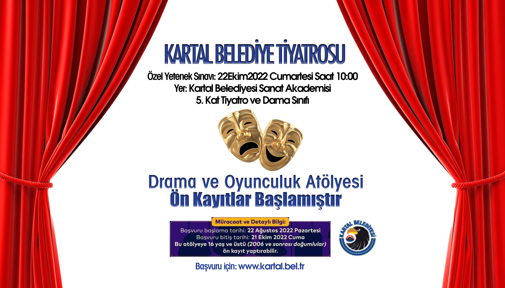 Kartallı gençlerin hayatın her alanında kendilerini daha iyi ifade edebilmeleri, farklı yönlerini keşfedebilmeleri, hayallerindeki mesleği yapabilmeleri amacıyla hizmet veren Kartal Belediye Tiyatrosu Drama ve Oyunculuk Atölyesi, 2022-2023 eğitim dönemi için ön kayıtları almaya başladı.16 yaş ve üstü öğrencilerin özel yetenek sınavı ile kabul edildiği Kartal Belediye Tiyatrosu Drama ve Oyunculuk Atölyesi'nin özel yetenek sınavı, 22 Ekim 2022 Cumartesi günü saat 10.00'da Kartal Belediyesi Sanat Akademisi 5. Kat Tiyatro ve Drama Sınıfı’nda yapılacak. Ön kayıtlar için son tarih ise 21 Ekim 2022 Cuma günü.Oyuncu adayları yetenek sınavında hazırladıkları bir komedi ya da dram parçası, bir şiir ve bir şarkı ya da türkü söyleyecek. Özel yetenek sınavını geçen öğrenciler, ücretsiz ve iki yıl sürecek kapsamlı bir drama ve oyunculuk eğitimi almaya hak kazanacak.Başvuruda bulunmak isteyen adaylar, www.kartal.bel.tr adresini ziyaret edebilir, ön kayıtlar ve yetenek sınavı ile ilgili bilgi almak için ise 0216 280 67 12-13 ve 0216 280 67 17 numaralı hattı arayabilirler.