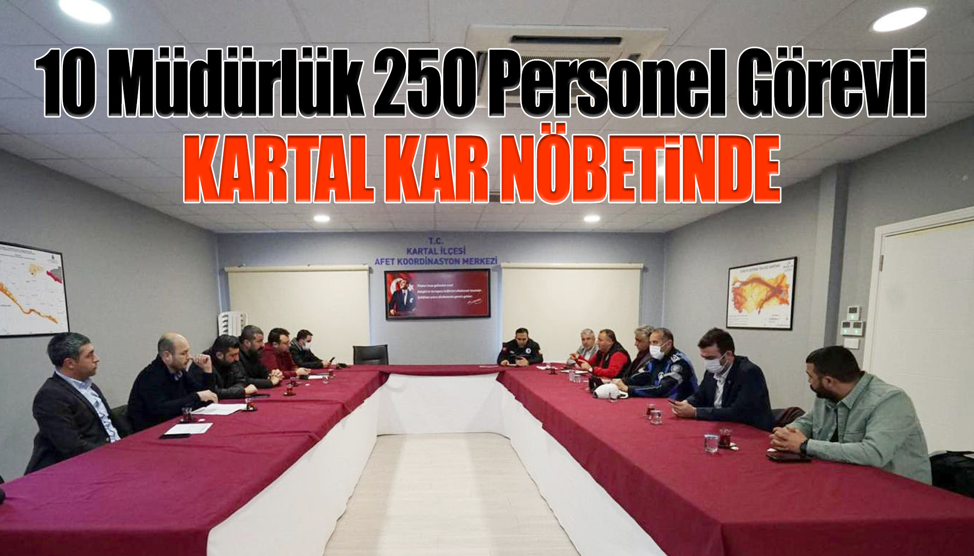 Kartal Belediyesi Sivil Savunma Uzmanlığı bünyesinde bulunan salonda kar yağışı ile ilgili tedbirlerin ele alındığı bir toplantı gerçekleşti.Meteoroloji Genel Müdürlüğü'nün tahminleri doğrultusunda beklenen kar yağışı için Kartal Belediyesi'nin ilgili birim müdürleri, Sivil Savunma Uzmanlığı bünyesinde bulunan salonda düzenlenen ortak toplantıda bir araya geldi. Yoğun kar yağışının gerçekleşeceği 2 gün için yapılan program doğrultusunda, 10 müdürlük tarafından 250 personel görevlendirildi.Toplantıya Kartal Belediyesi Temizlik İşleri, Fen İşleri, Destek Hizmetleri, Park ve Bahçeler, Sivil Savunma, Veteriner İşleri, Sosyal Yardım İşleri, Yapı Kontrol, Zabıta, Basın Yayın ve Halkla İlişkiler birimlerinin müdürleri ile Sosyal Medya ve Komşu İletişim Merkezi'nin temsilcileri katıldı.10 Müdürlük Tarafından 250 Personel GörevlendirildiYaklaşık iki saat süren toplantıda belediye birim müdürlükleri, tespit edilen olumsuzluklara yönelik anında ve ortak müdahale yürütmek için tamamladıkları çalışmalarını paylaştı.Kar yağışının yoğun olarak beklendiği 2 gün için yapılan program doğrultusunda, 10 müdürlük tarafından 250 personel, 4 tuzlama aracı, 14 iş makinası, 8 küreme aracı, 4 tuz nakil aracı, 9 saha sorumlusu görevlendirilirken, 700 ton tuz, kullanılmak üzere hazır hale getirildi.Kartal'ın özellikle E-5 üstü riskli noktalarında 12 saatlik, 2 vardiya halinde yapılacak çalışmalar kararlaştırıldı. Soğuk havanın etkisini artırmasıyla teyakkuzda olan ekipler, kar yağışına anında müdahale edecek.Kar küreme ve tuzlama ekipleri ise yağış esnasında kapanma riski olan yollarda, 24 saat çalışmalarını sürdürecek.Öte yandan Kartal Belediyesi Fen İşleri, Temizlik İşleri ve Park Bahçeler Müdürlüğü ekipleri tarafından hastanelerin, nöbetçi eczanelerin, tüm dini ibadethaneler ile okulların giriş noktalarına tuz serpme işlemi gerçekleştirildiği belirtildi.