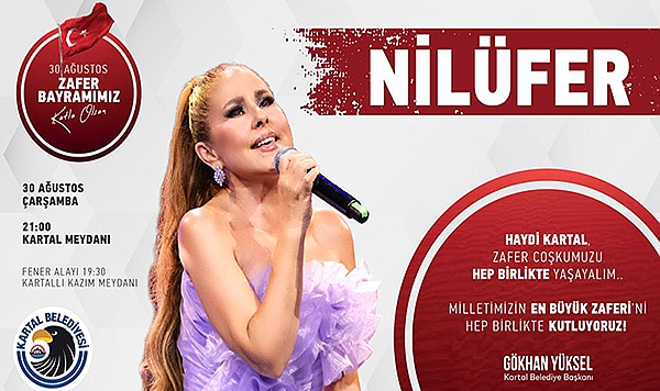 Kartal Belediyesi tarafından düzenlenecek kutlama programı kapsamında 30 Ağustos Çarşamba akşamı saat 19.30’da Kartallı Kazım Meydanı’ndan başlayacak olan fener alayı, Kartal Meydanı’nda yapılacak olan konser ile devam edecek. Kartallıları buluşturan fener alayının ardından sanatçı Nilüfer birbirinden güzel şarkılarıyla sahne alacak. Ünlü sanatçı Nilüfer saat 21.00’da şarkılarını Kartallılarla birlikte seslendirecek.