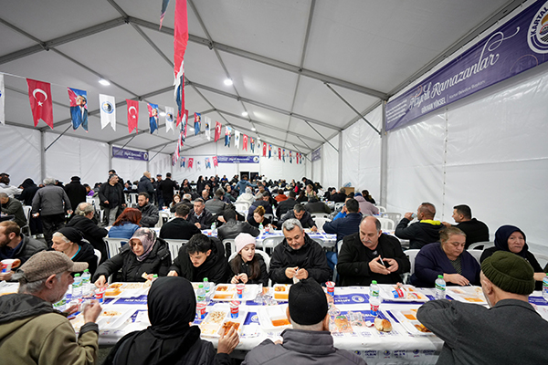 Koşuyolu Kalp Hastanesi Otoparkı’nda kurulan sabit iftar ve sahur alanı; özellikle hasta yakınları, sağlık çalışanları ve iftar saatinde evine yetişemeyen vatandaşlar için önemli bir buluşma noktası oldu. Kartal Belediyesi personeli tarafından özenle hazırlanan iftar menüleri, düzenli organizasyon ve titiz bir planlamayla vatandaşlara hizmet verdi.