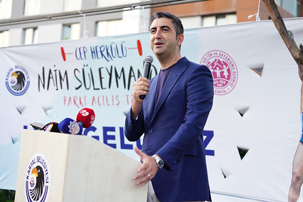 Açılış töreninde konuşan Kartal Belediye Başkanı Gökhan Yüksel, “Naim Süleymanoğlu’nun başarılarıyla büyüyen çocuklardan bir tanesiyim. Kendisinden 3 kat ağırlıkta halteri kaldıran bir sporcu, deha. Fakat daha sonra kupalardan ve madalyalardan daha büyük şeyler başardığını büyüdüğümde öğrendim. Hem sporun gücü, hem sanatın gücüyle sinemaya yansıyan filminden sonra gözyaşlarımı tutamadığım anlar oldu. Anladım ki, madalyalardan daha kıymetli şeyler başarmış. Naim Süleymanoğlu’nun Türkiye Cumhuriyeti’ne kazandırdığı, Türklüğe kazandırdığı… Bulgaristan’da yaşayan Türklerin önderliğini yaptı ve sporun gücüyle bunu dünyaya duyurdu. Bu büyüklüğü, bu duruşu, kendisine neler teklif edilmesine rağmen hepsini reddedip bunu başarması ve bugünlere getirmesi çok kıymetliydi. Bunun dilden dile söylenmesi ve nesilden nesile aktarılması gerekiyordu. Bu parkımız baştan aşağıya yenilendi. Komşularımızın ve çocuklarımızın oynayacağı bir alan haline geldi. Fakat Naim Süleymanoğlu ismi ve onun bilgileri, büstü çocuklarımızda merak uyandırsın. Kimdi bu sporcumuz densin. Naim Süleymanoğlu’nun sporculuğu ve duruşu unutulmasın diye bu adımı attık. Hepimize hayırlı uğurlu olsun. Naim Süleymanoğlu’nun ismi ve büyüklüğü unutulmasın. Naim Süleymanoğlu sadece Balkan camiasının kahramanı değil, Türkiye Cumhuriyeti’nin kahramanıdır.” ifadelerini kullandı.