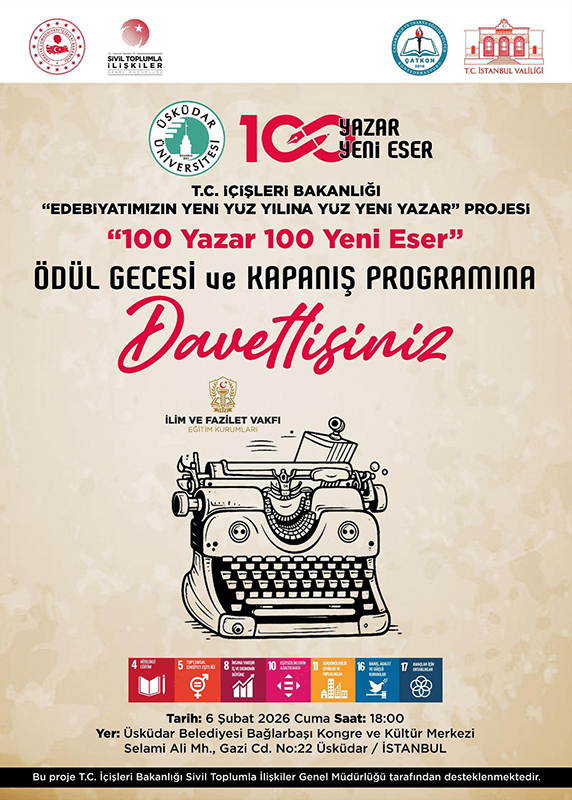 T.C. İçişleri Bakanlığı Sivil Toplumla İlişkiler Genel Müdürlüğü’nün destekleri ve İstanbul Valiliği’nin himayelerinde hayata geçirilen “Edebiyatımızın Yeni Yüz Yılına Yüz Yeni Yazar” Projesi, Türkiye’nin kültürel ve edebi geleceğine yönelik önemli bir vizyon ortaya koyuyor. Üsküdar Üniversitesi’nin bilimsel danışmanlığında yürütülen proje, Çanakkale ve Trakya Eğitim Kültür Konfederasyonu’nun yürütücülüğünde ve İlim ve Fazilet Vakfı Eğitim Kurumları’nın uygulama desteğiyle gerçekleştiriliyor. Branding Türkiye‘nin iletişim partneri olduğu ve 6 Şubat 2026‘da gerçekleşecek olan 100 Yazar 100 Yeni Eser projesi ödül gecesi, ekosistem paydaşları tarafından desteklenirken; ödül töreninde akademi, edebiyat, sivil toplum ve kamu temsilcileri buluşacak.Türk Edebiyatının Yeni Yüzyılına Güçlü Katkı“Edebiyatımızın Yeni Yüz Yılına Yüz Yeni Yazar” projesi kapsamında genç ve üretken yazarlar tarafından kaleme alınan eserler, Türk edebiyatının yeni yüzyılına güçlü bir başlangıç niteliği taşıyor. Bu eserlerin taçlandırılacağı “100 Yazar 100 Yeni Eser – Ödül Gecesi ve Kapanış Programı”, 06 Şubat 2026 Cuma günü İstanbul Üsküdar’da bulunan Bağlarbaşı Kongre ve Kültür Merkezi’nde düzenlenecek.Programda, projeye katkı sunan genç yazarlar ödüllendirilerek onurlandırılacak. Aynı zamanda edebiyatın toplumsal dönüşümdeki rolü, kültürel mirasın korunması ve gelecek kuşaklara aktarılması konularında ortak bir vizyon paylaşılacak. Etkinlik, Türk edebiyatının yalnızca sanatsal değil, aynı zamanda toplumsal hafızayı güçlendiren bir değer olduğuna da dikkat çekecek.Akademi, iş dünyası, edebiyat, medya, sivil toplum ve kamu temsilcilerini aynı çatı altında buluşturacak olan ödül gecesi, edebiyatın birleştirici gücünü görünür kılmayı amaçlıyor. Programa; Üsküdar Üniversitesi Kurucu Rektörü ve Yönetim Üst Kurul Başkanı Prof. Dr. Nevzat Tarhan ile İlim ve Fazilet Vakfı Eğitim Kurumları Yönetim Kurulu Başkanı Mahmut Ekşi ev sahipliği yapacak.Program DetaylarıAkademi, iş dünyası, edebiyat, medya, sivil toplum ve kamu temsilcilerini aynı çatı altında buluşturacak olan “100 Yazar 100 Yeni Eser – Ödül Gecesi ve Kapanış Programı”nın etkinlik detayları şöyle;Tarih: 06 Şubat 2026, CumaSaat: 18.00 – 22.00Mekân: Üsküdar Belediyesi Bağlarbaşı Kongre ve Kültür MerkeziAdres: Selami Ali Mah., Gazi Cd. No:22, Üsküdar / İstanbul